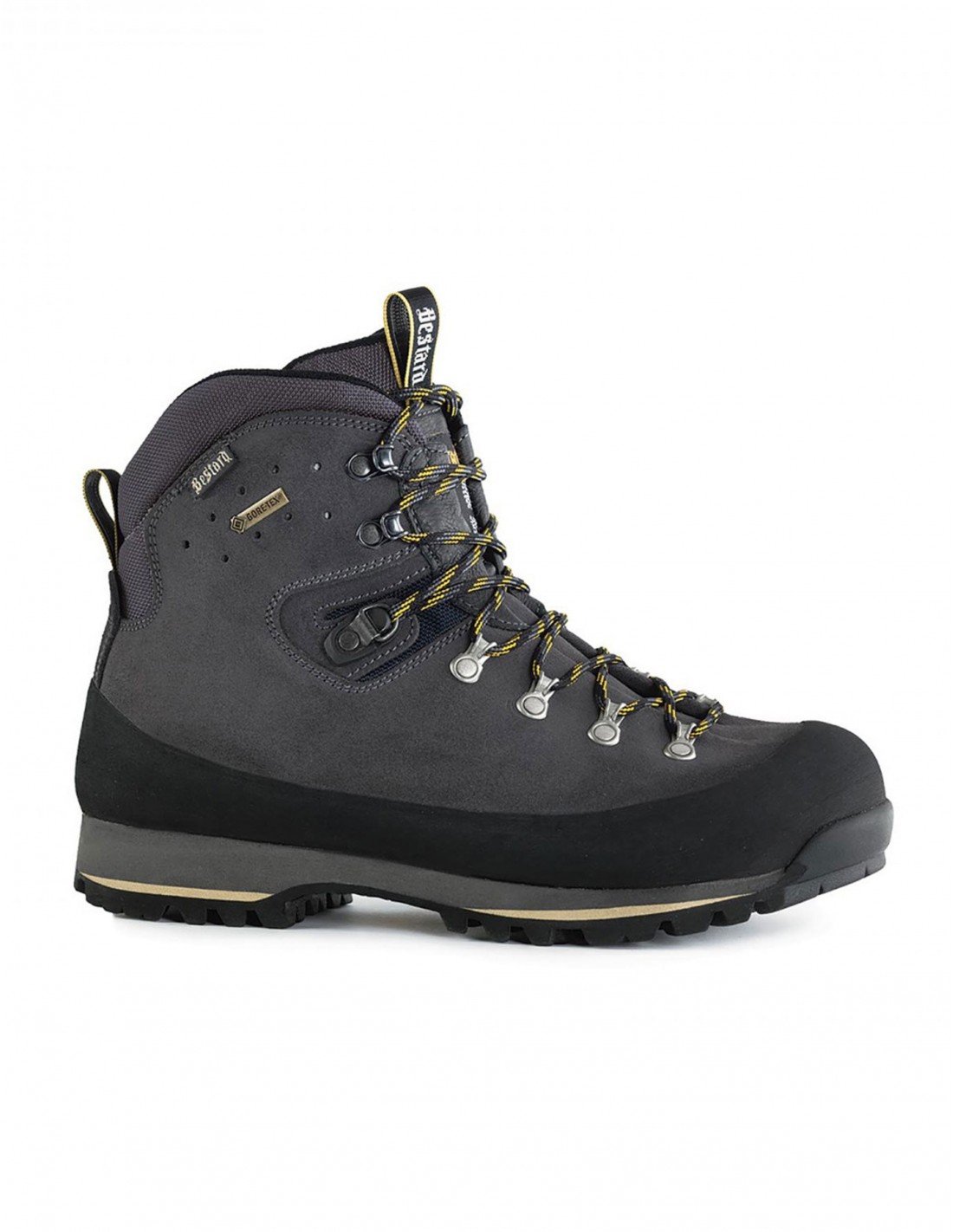 La parte superior está confeccionada en piel hidrófuga, destacando por ser una sola pieza sin costuras, lo que le da una durabilidad superior y permite un ajuste cómodo y seguro. Está reforzada con una bandoleta de goma para protección extra. La bota asegura impermeabilidad y transpirabilidad gracias al forro GORE-TEX®, mientras que su suela Vibram® garantiza un agarre fiable.