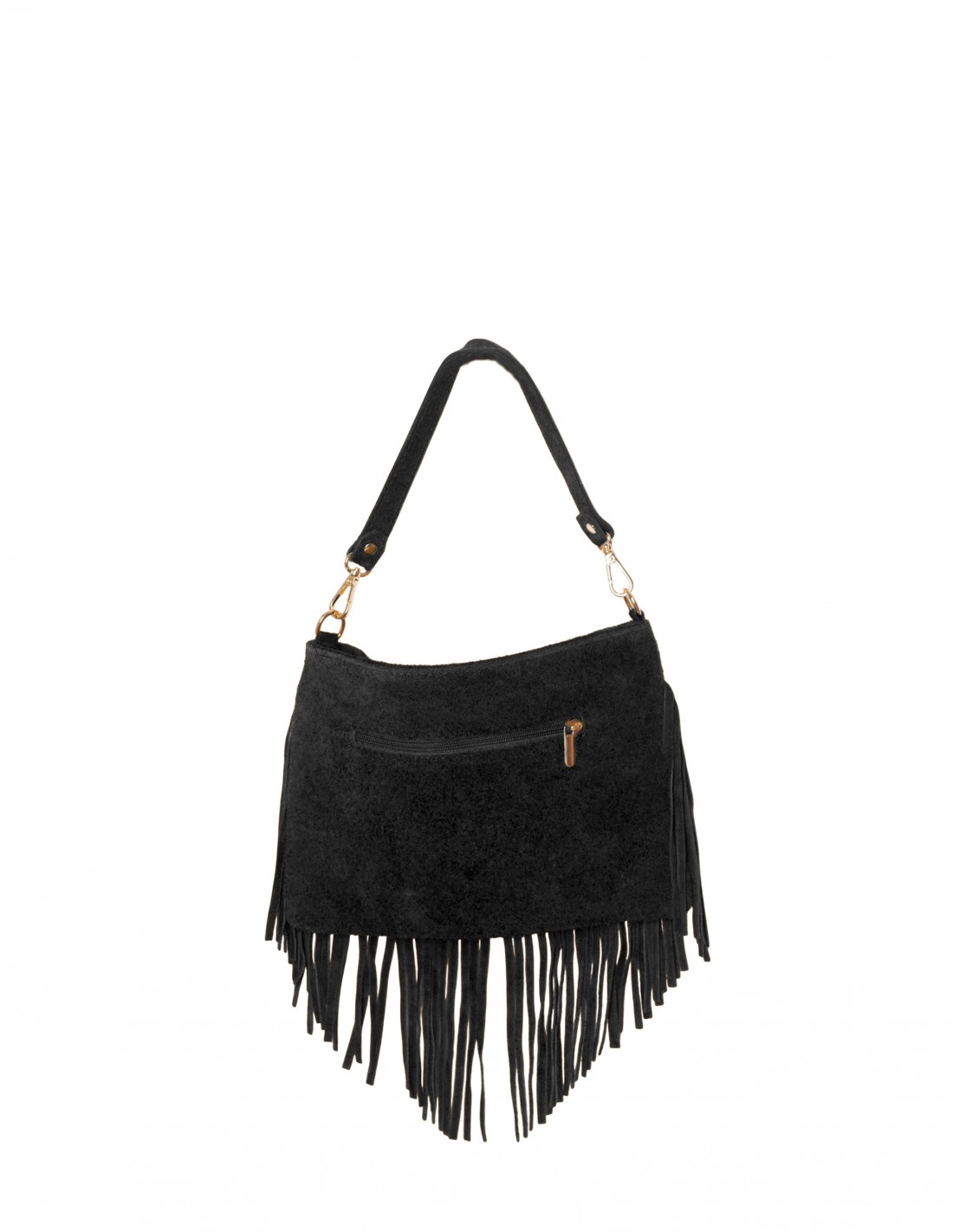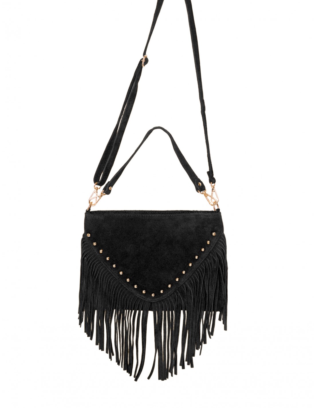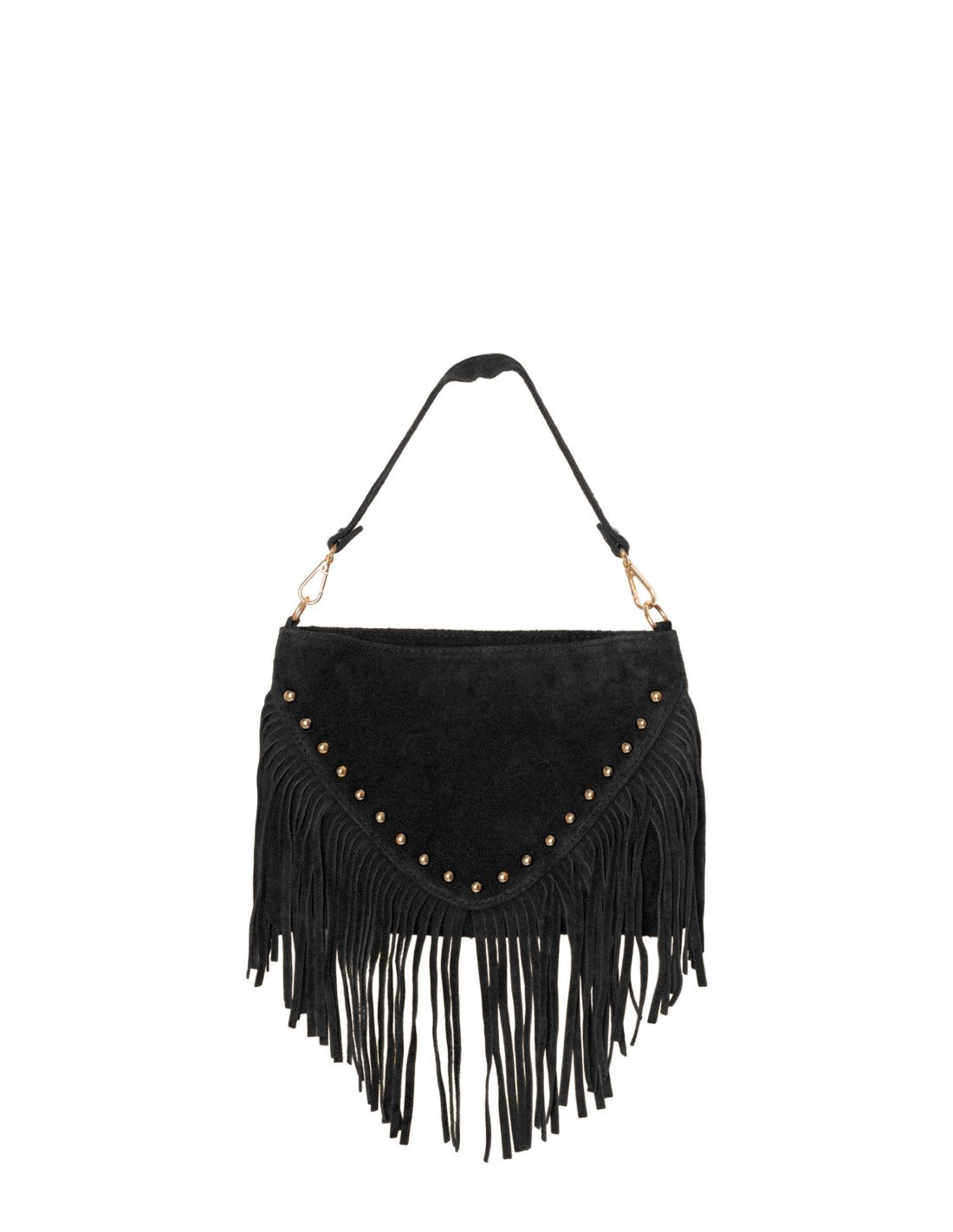 Este bolso de piel ante negra captura a la perfección la esencia del estilo boho-chic con un toque atrevido. Su diseño está marcado por una caída de flecos y realzado con tachuelas metálicas que le otorgan un aire distintivo y moderno.