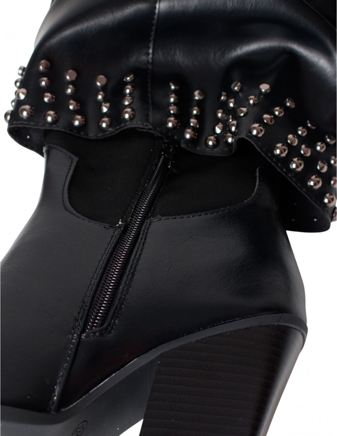 Lo que las hace únicas son los detalles metálicos: una fila de tachuelas plateadas recorre todo el bajo de la caña, y una hebilla del mismo tono adorna la parte superior lateral. El look se completa con una puntera acabada en punta y un robusto tacón ancho de unos 8 centímetros.