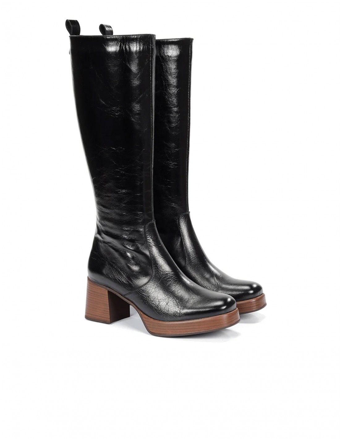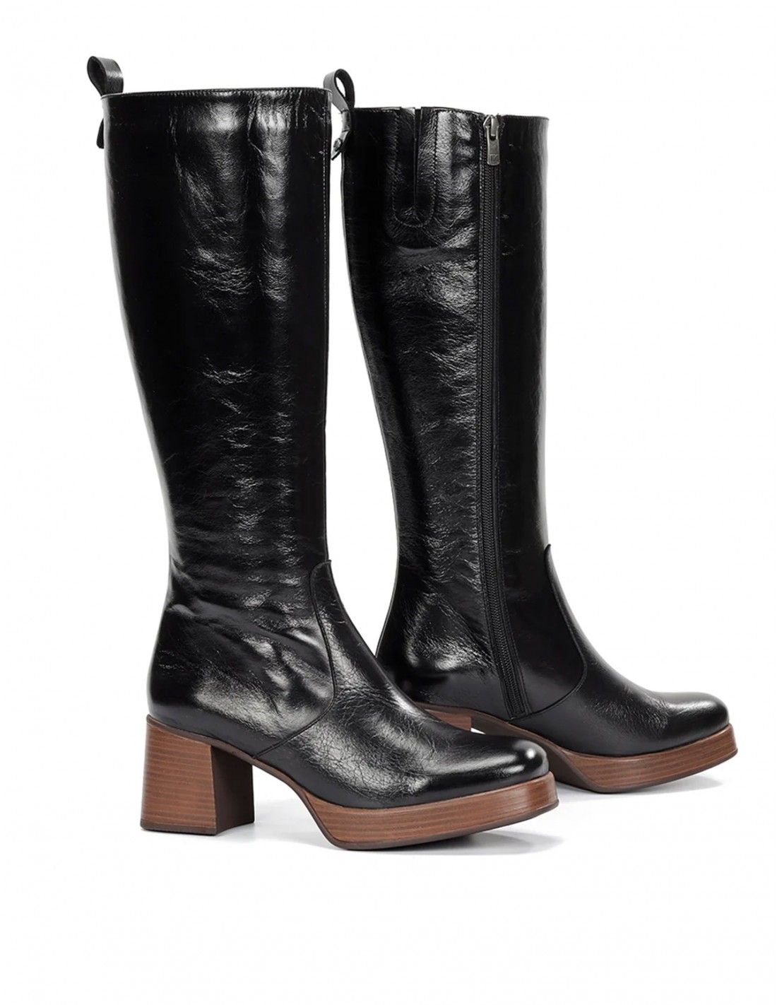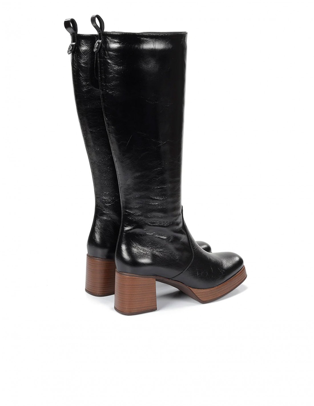 De apariencia elegante y moderna, las botas altas Cristel elevarán exponencialmente tus looks. Confeccionadas en piel negra con un llamativo acabado brillante y con plataforma delantera, consiguen un look sofisticado sin perder la sencillez.