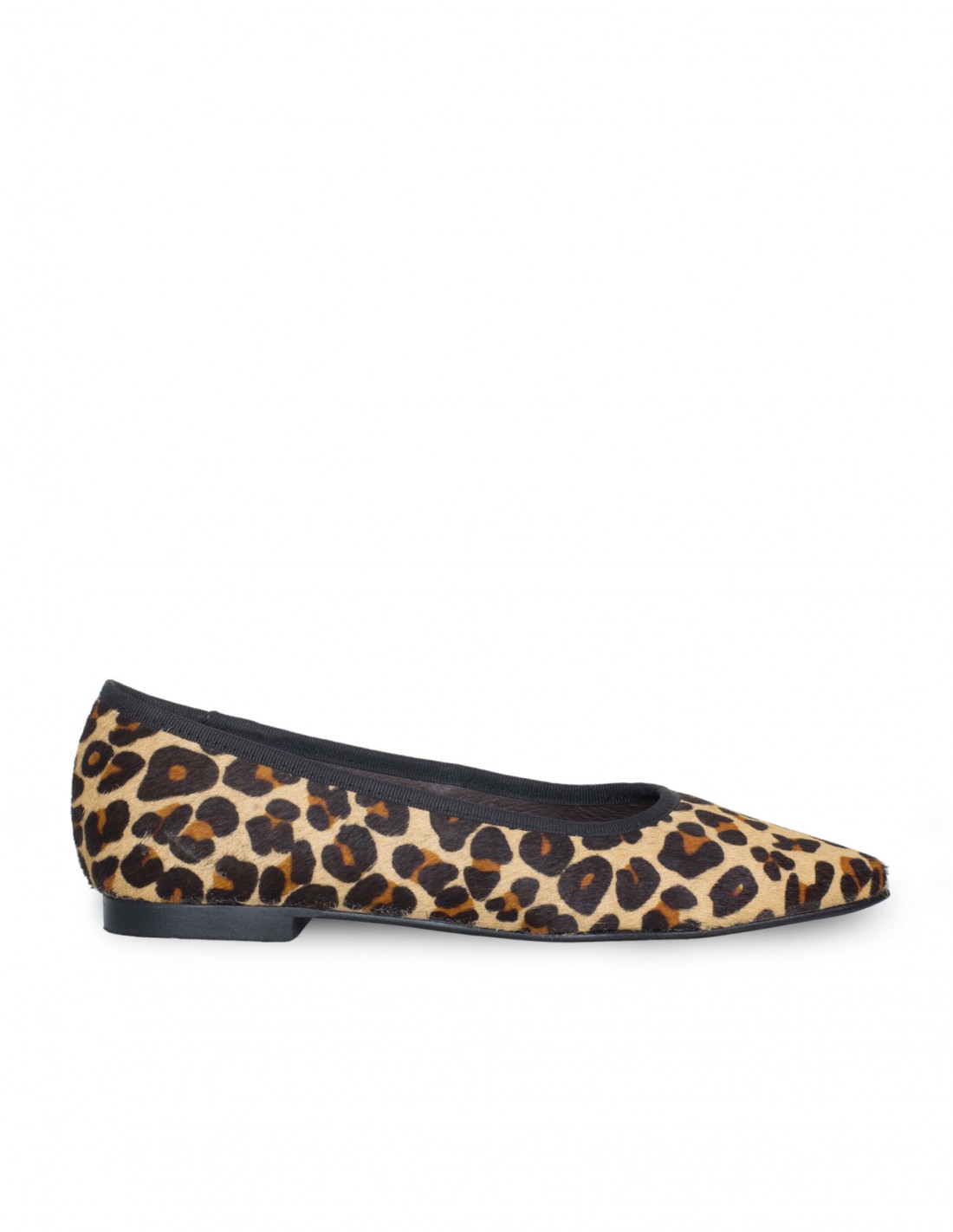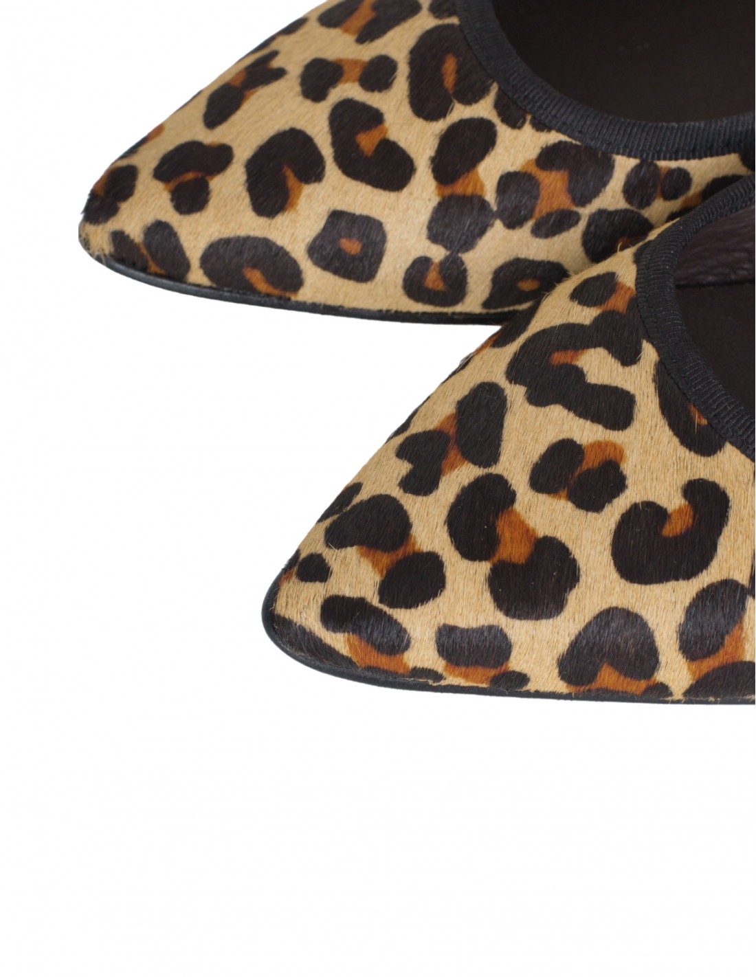 Bailarinas planas estilo manoletina, fabricadas en piel con pelo y estampado de leopardo. Su diseño presenta una puntera ligeramente afilada y un cómodo tacón plano. Además, cuentan con una plantilla suave y acolchada para regalarte el máximo confort en cada paso.