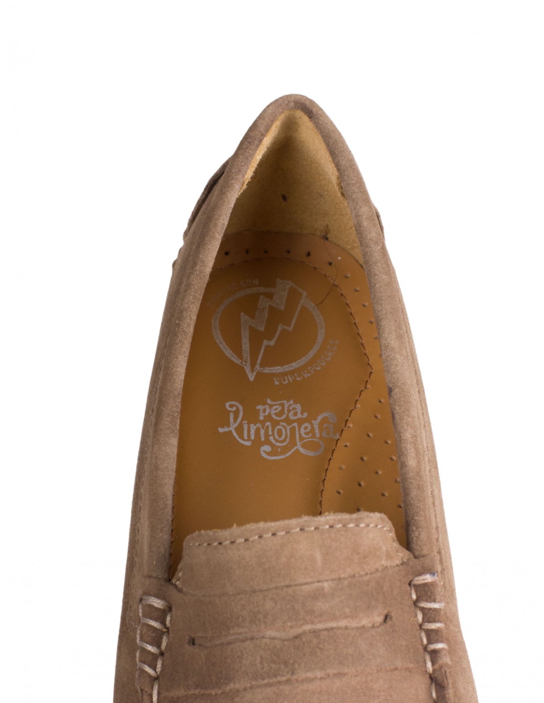 Mocasines de piel de ante de color taupe para mujer de nuestra marca propia Pera Limonera. Diseño con suela conductora de tacos de goma que suben hasta la zona del talón. Detalle de máscara y costuras cosidas a mano. Plantilla anatómica acolchada. Estos mocasines están fabricados por expertos artesanos utilizando los mejores materiales seleccionando meticulosamente el color y la textura. Muy flexibles y cómodos. Forro vacuno.