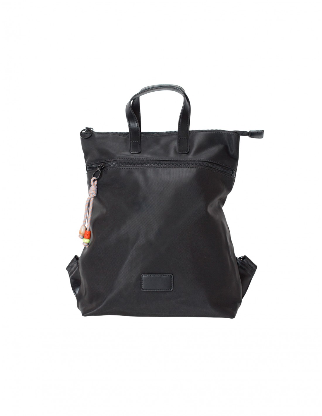 Cuenta con un bolsillo frontal espacioso y otro bolsillo trasero con cremallera para mantener tus esenciales siempre a salvo. Puedes llevarla cómodamente de la mano gracias a sus asas superiores o colgártela a la espalda ajustando sus asas regulables. El charm decorativo aporta ese toque moderno y sutil que marca la diferencia.