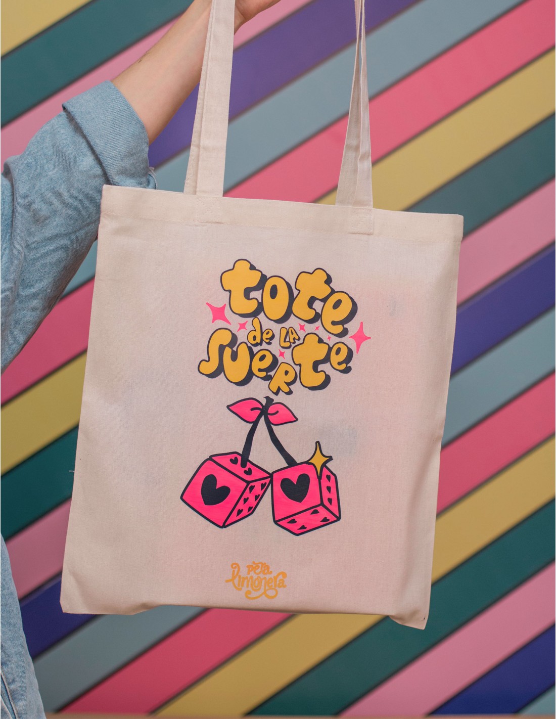 ¿List@ para un golpe de suerte? En Pera Limonera hemos diseñado esta tote bag de tela para ser tu amuleto de la fortuna personal. Nuestra ilustración exclusiva convierte dos dados de la suerte en cerezas con un corazón en cada cara, simbolizando que arriesgarse (con corazón) es la clave de la buena fortuna. Incluye el mensaje "Tote de la suerte" en una tipografía retro y colores vibrantes, es perfecta para darle un toque divertido y original a tus looks diarios. ¡Lleva tu suerte al hombro y atrae solo good vibes!