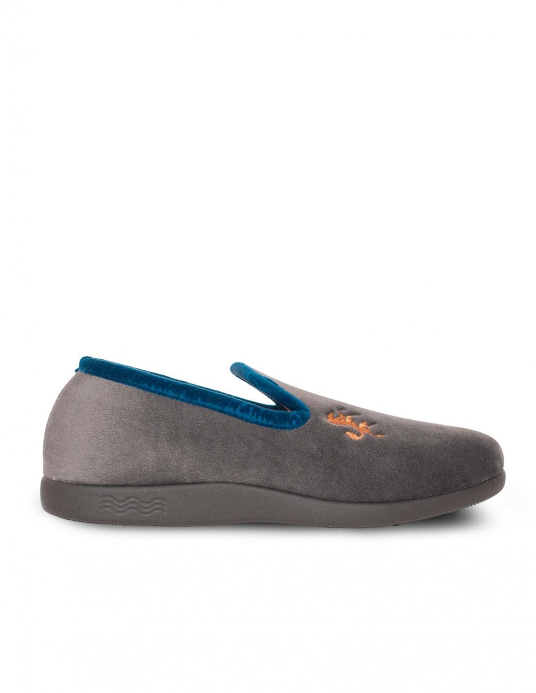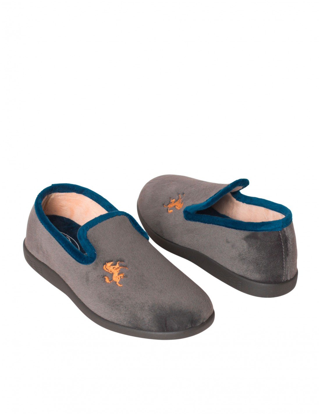 Estas zapatillas de casa para hombre son perfectas para quienes buscan un diseño clásico y elegante sin renunciar al máximo confort. El diseño cerrado está confeccionado en pelo gris suave con un distinguido ribete en color azul. El detalle de un caballo bordado en naranja aporta un toque distintivo. Son las zapatillas perfectas para estar calentito en casa. Cuentan con plantilla extraíble y suela antideslizante para una comodidad y funcionalidad óptima. Además, están hechas en España, garantizando una excelente calidad. Estas zapatillas de casa cerradas se convertirán en imprescindibles en tu fondo de armario para estar en casa cómodamente.